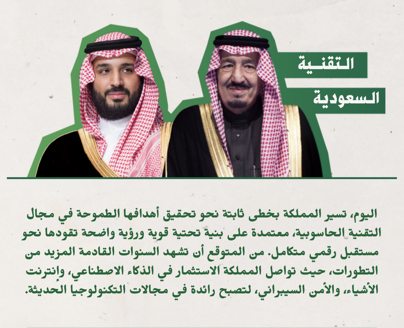 من خلال نظرة إلى الوراء على مدى ٩٤ عاماً ، نستطيع تتبع مسيرة التقنية في المملكة ، والتي بدأت بخطوات متواضعة لتصبح اليوم واحدة من الروّاد في هذا المجال على مستوى العالم -نسخة اليوم الوطني-
